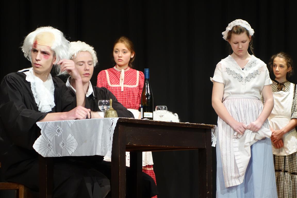 So konnten die ansonsten selbst auf der Bühne Agierenden hier nicht nur die überzeugende Darstellung der beteiligten Schauspieler genießen – für manche etwas durch den Berliner Dialekt erschwert – sondern nebenbei Gestaltungsmöglichkeiten von Bühnenbau, Zeit, Licht- und Tontechnik und Requisiten erleben. So waren Dachboden und John´sche Wohnung hier vertauscht worden – die Wohnungsebene schwebte von langen Drahtseilen gehalten über dem Requisitenraum und konnte sowohl in Höhe als auch in der Schräge variiert werden. Die sparsam ausgestaltete Wohnung (Tisch und zwei Stühle) ließ den Schauspielern die Möglichkeit, mit ihrer Präsenz den Raum zu füllen. Außerdem spielten z.T. Handlungsstränge parallel, während die Spieler in der John´schen Wohnung agierten, konnte der Zuschauer gleichzeitig Vorgänge auf dem Dachboden beobachten.